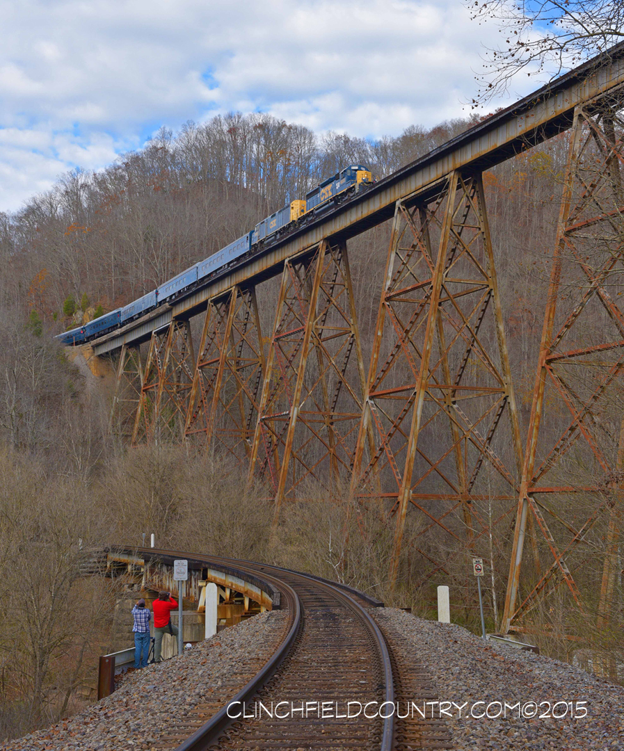 The Santa Train glides high across the famous Copper Creek Viaduct near Clinchport, VA.