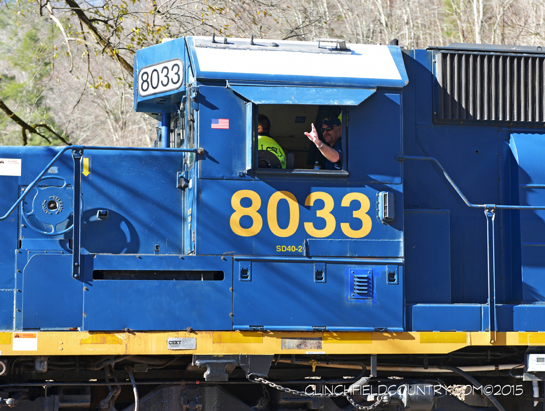 A member of the Santa Train's head end crew gives a friendly wave as the train pulls out of Dante, VA.